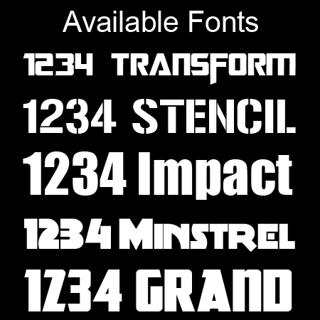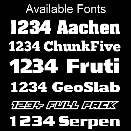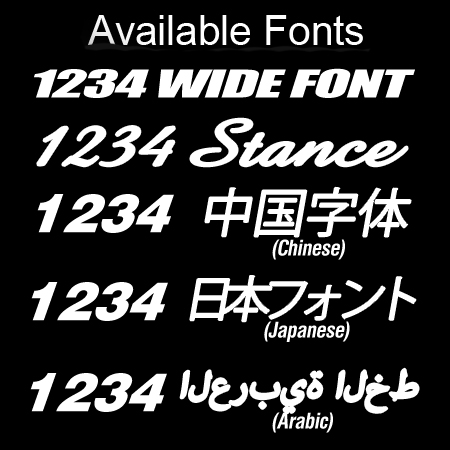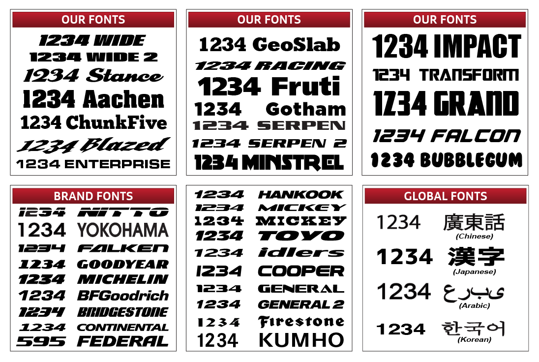 | Font Type: | Aachen, Achilles (Only for Achilles orders), Arabic, BF Goodrich(Only used for BF Goodrich orders), Bubble Gum, Continental Font (Only for Continental order), Chinese, Chunk Five, Dunlop (Only for Dunlop orders), Federal Font (Only for Federal prders), Fruiti, Full Pack, General Tire (Only for General orders), GeoSlab, GoodYear Font (Only for GoodYear orders), GRAND, Handkook Font (Only for Hankook orders), Hoosier Font (Only for Hoosier orders), Impact, Jappanese, Kumho (Only for Kumho orders), Michelin (Only for Michelin orders), Minstrel, Nankang (Only for Nankang orders), Nexen (Only for Nexen orders), Nitto font, Serpentine, Stencil, Stance Font, Transform, Toyo Tires font, WIDE Font, Yokohama Font (Only for Yokohama orders), Font not listed – Leave note on checkout |